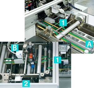 Precise printing of code or serial number… - A jogging device (A) aligns the outserts for printing.